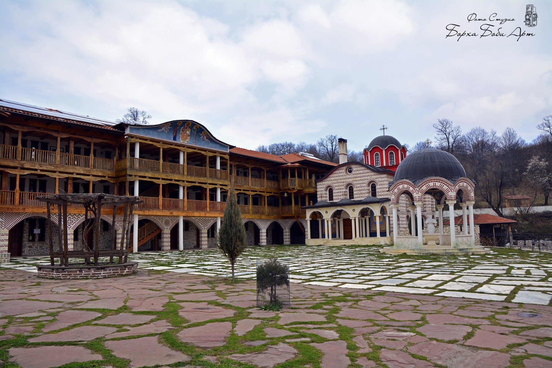 Панорама на двора и аязмото на „Св. Св. Козма и Дамян“